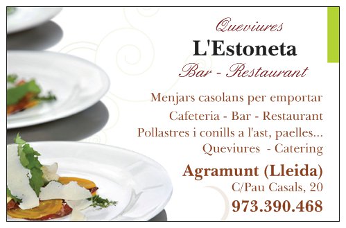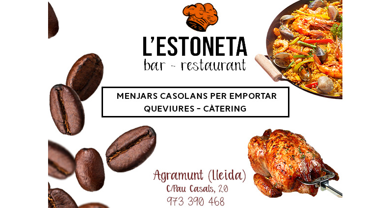Al Restaurant L’Estoneta oferim una àmplia gamma de serveis, incloent-hi menjars casolans per emportar, cafeteria, bar i restaurant. Gaudeix dels nostres deliciosos pollastres i conills a l’ast, així com de les nostres paelles i compra els teus queviures pels més estimats, per tenir un gran record d’Agramunt.